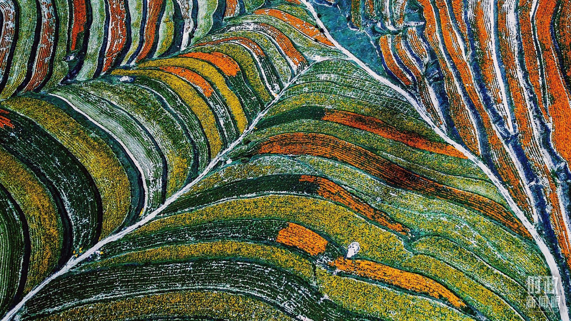 △寧夏彭陽縣。萬壽菊與格?;ㄊ㈤_在錯落的山間梯田上。(總臺國廣記者李晉拍攝)