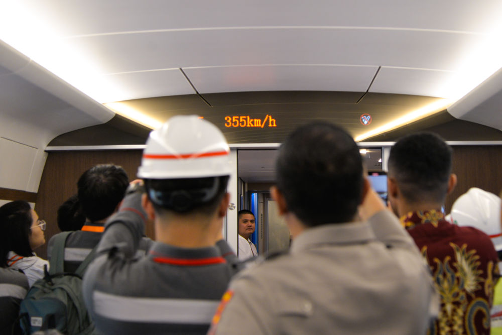 6月22日,印度尼西亞雅萬(wàn)高鐵聯(lián)調(diào)聯(lián)試綜合檢測(cè)列車運(yùn)行時(shí)速首次達(dá)到350公里。這是記者和工作人員拍攝顯示列車時(shí)速的電子屏。新華社記者 徐欽 攝