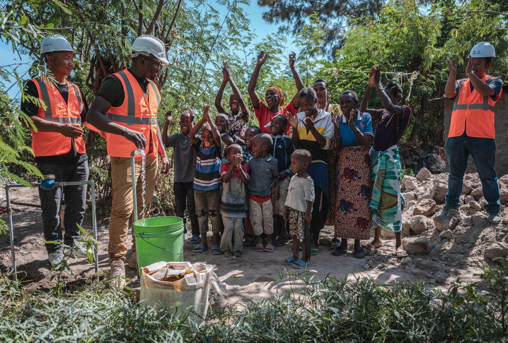 6月13日,在坦桑尼亞姆萬(wàn)扎省米松圭,中土東非有限公司員工接通水管后贏得當(dāng)?shù)鼐用窆恼茪g呼。新華社記者 王冠森 攝