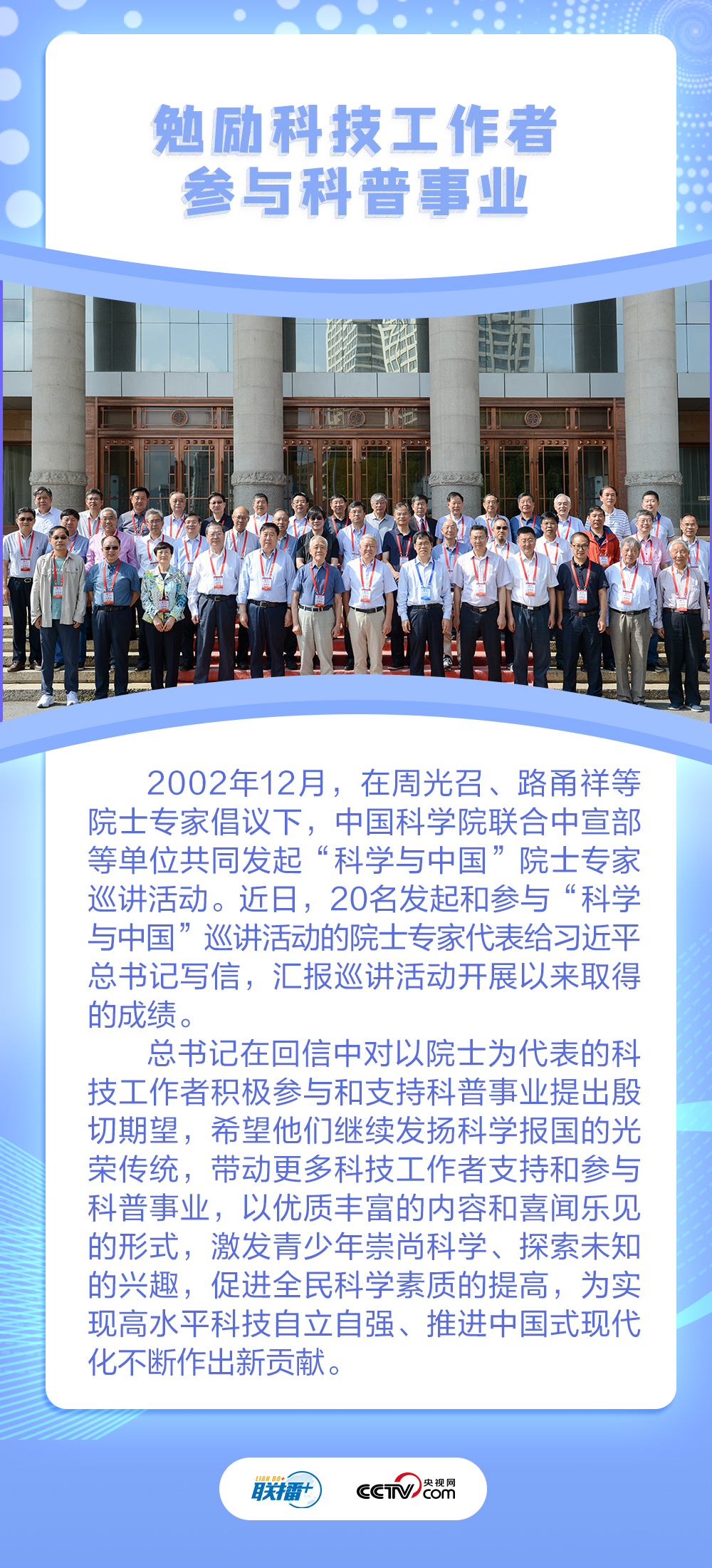 聯(lián)播+“多年來,你們積極參加‘科學(xué)與中國’巡講活動(dòng),廣泛傳播科學(xué)知識(shí)、弘揚(yáng)科學(xué)精神,在推動(dòng)科學(xué)普及上發(fā)揮了很好的作用?!?/p>