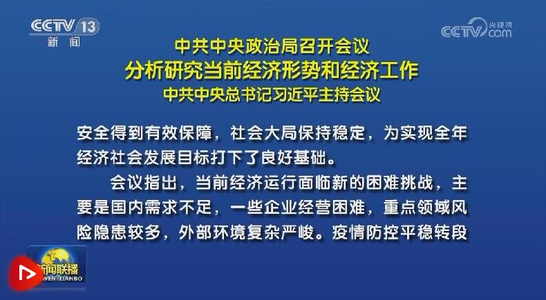 7月24日,中共中央政治局召開會(huì)議,分析研究當(dāng)前經(jīng)濟(jì)形勢(shì),部署下半年經(jīng)濟(jì)工作。習(xí)近平總書記主持會(huì)議。