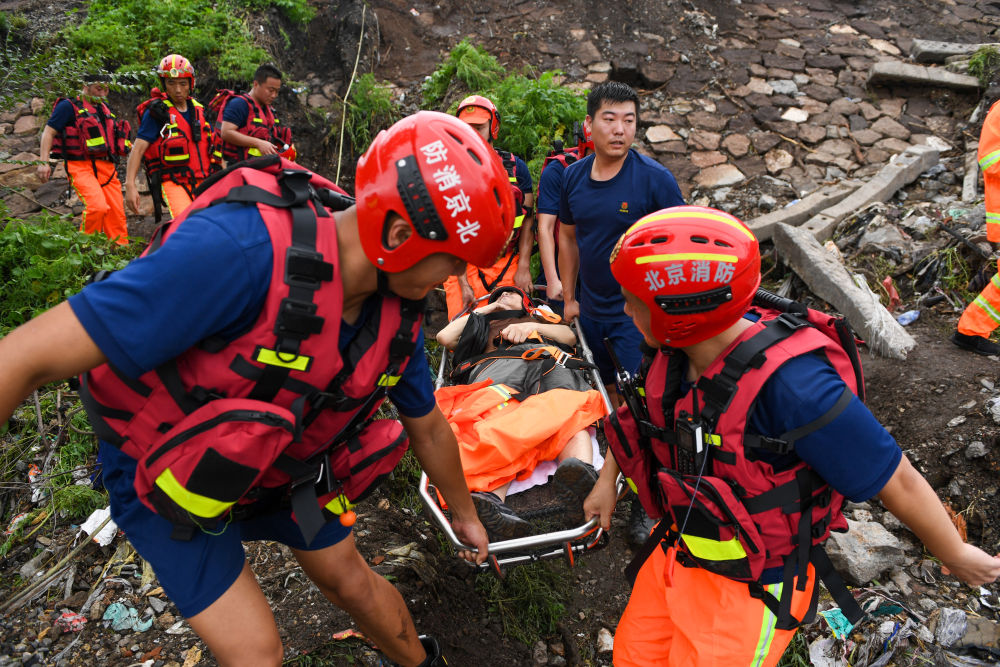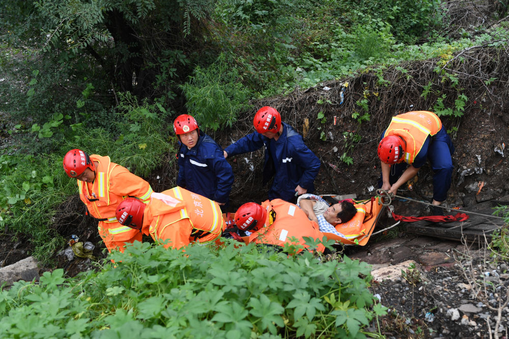 8月1日,在北京市門頭溝區(qū)水峪嘴村,北京門頭溝區(qū)消防救援支隊(duì)的消防員在轉(zhuǎn)運(yùn)一名受傷村民。新華社記者 鞠煥宗 攝