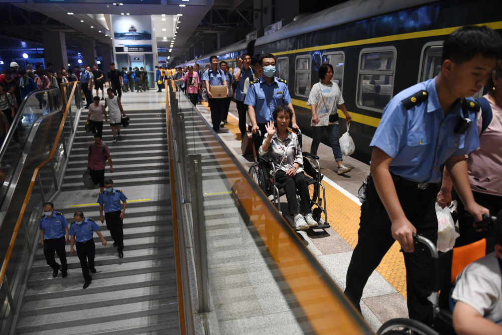 8月3日,K396次、Z180次列車的滯留旅客到達(dá)北京豐臺(tái)站。新華社記者 張晨霖 攝
