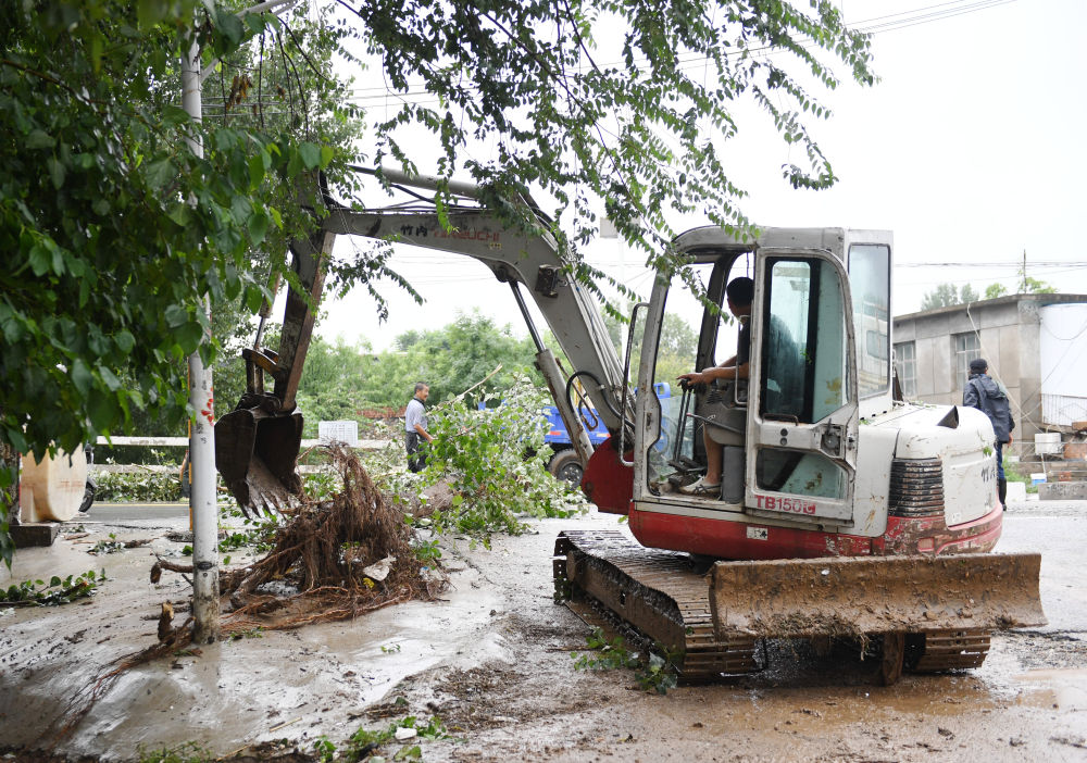 8月1日,在北京市房山區(qū)青龍湖鎮(zhèn)上萬(wàn)村,工作人員清理倒伏樹木。新華社記者 張晨霖 攝