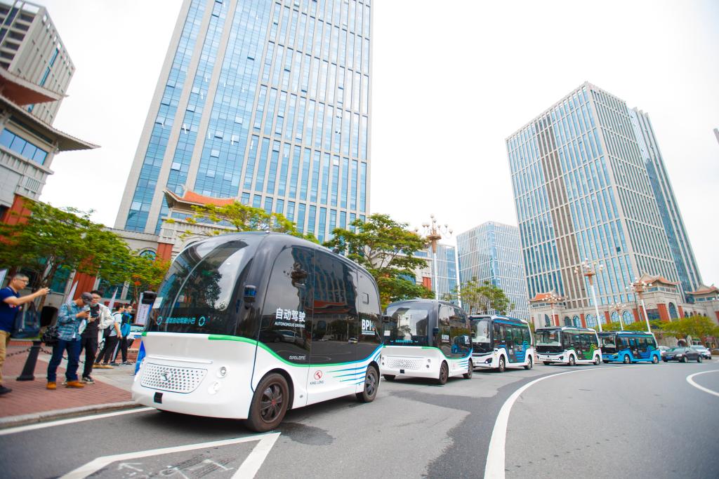 在金龍汽車廈門園區(qū)里,一輛輛無人駕駛安防車沿著預(yù)設(shè)路線巡邏,車頂?shù)脑婆_攝像機(jī)實(shí)時記錄著園區(qū)車輛信息、消防安全以及人員行為等數(shù)據(jù)。