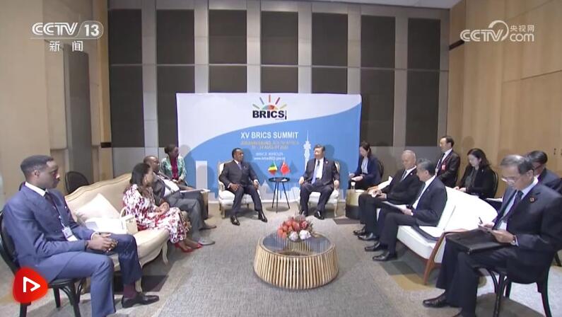 當?shù)貢r間8月24日上午,國家主席習(xí)近平在約翰內(nèi)斯堡出席金磚國家領(lǐng)導(dǎo)人會晤期間會見剛果(布)總統(tǒng)薩蘇。