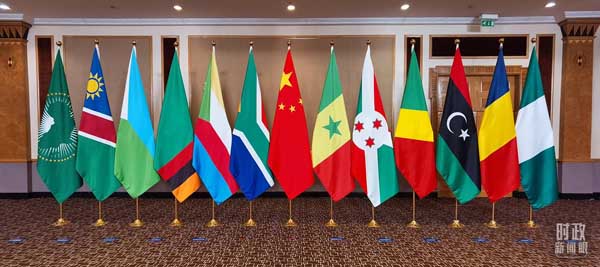 △中非領(lǐng)導(dǎo)人對(duì)話會(huì)會(huì)場擺放的與會(huì)各方旗幟。(總臺(tái)央視記者郭鴻拍攝)