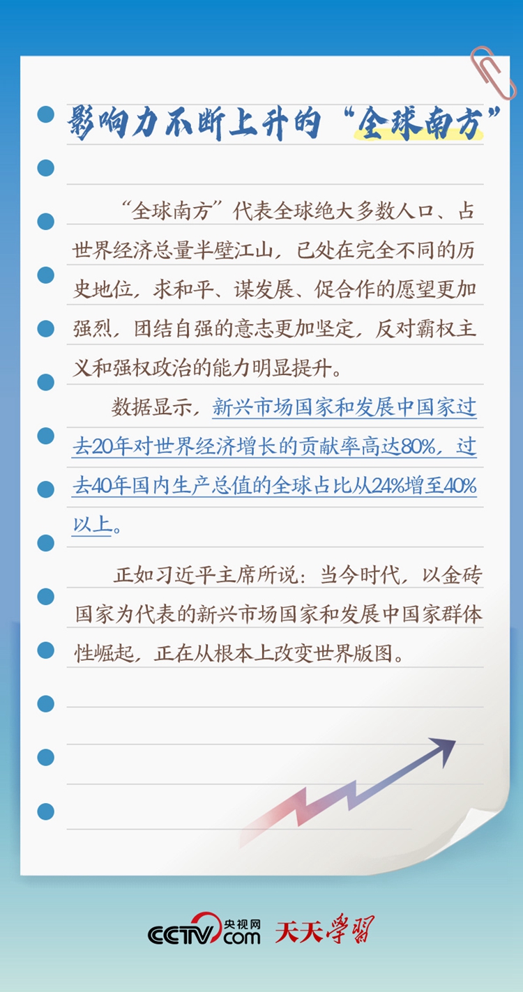 天天學(xué)習(xí)“作為發(fā)展中國家、‘全球南方’的一員,中國始終同其他發(fā)展中國家同呼吸、共命運”;“中南作為‘全球南方’天然成員,更要團結(jié)一致,共同呼吁擴大發(fā)展中國家在國際事務(wù)中的話語權(quán)和影響力”;“提升‘全球南方’國家在全球治理中的代表性和發(fā)言權(quán)”。 此次出訪,習(xí)近平主席在向約翰內(nèi)斯堡金磚國家工商論壇閉幕式發(fā)表致辭、同南非總統(tǒng)拉馬福薩共同會見記者等場合均提及“全球南方”。什么是“全球南方”?“全球南方”國家有何共性?中國為何是“全球南方”的天然成員?跟著央視網(wǎng)《天天學(xué)習(xí)》一起了解。