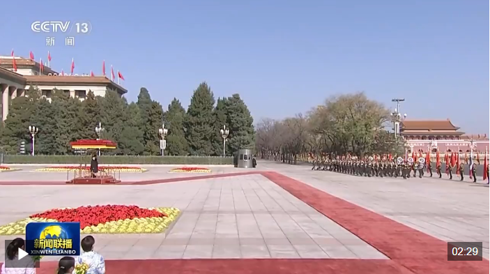 哇集拉隆功抵達(dá)時(shí),禮兵列隊(duì)致敬。習(xí)近平同哇集拉隆功登上檢閱臺(tái),軍樂(lè)團(tuán)奏中國(guó)國(guó)歌和泰國(guó)頌圣歌,天安門廣場(chǎng)鳴放禮炮21響。哇集拉隆功在習(xí)近平陪同下檢閱中國(guó)人民解放軍儀仗隊(duì),并觀看分列式。