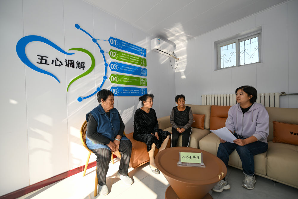 在天津市寧河區(qū)蘆臺(tái)街道金華路社區(qū),社區(qū)黨總支副書記吳蕊(右一)就社區(qū)監(jiān)控設(shè)備安裝問題為社區(qū)居民進(jìn)行解答(2024年10月11日攝)。金華路社區(qū)積極踐行新時(shí)代“楓橋經(jīng)驗(yàn)”,將原社區(qū)居委會(huì)閑置用地提升改造成為聯(lián)絡(luò)群眾的基層綜合治理陣地——“解鈴小院”。新華社記者 孫凡越 攝