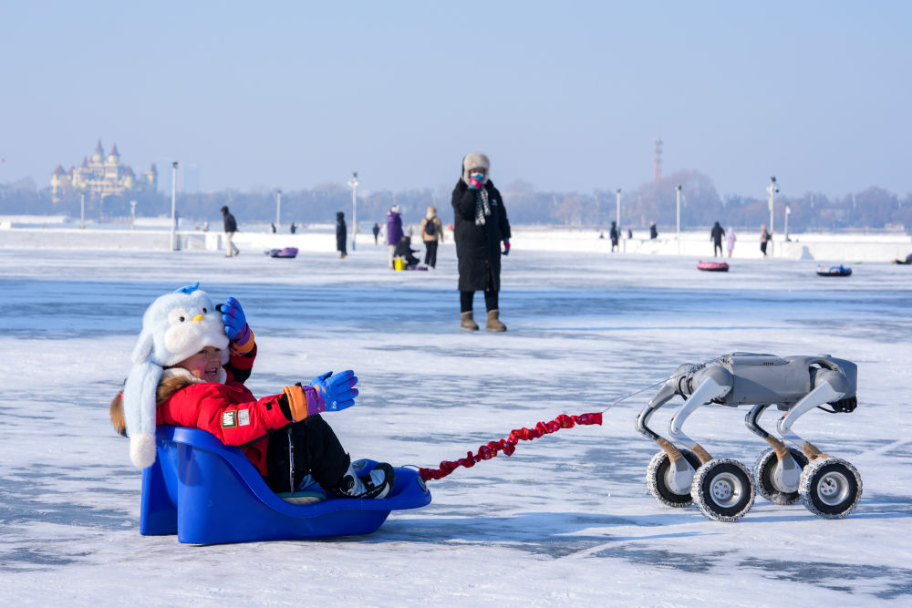 1月11日,小朋友在松花江哈爾濱段江面上體驗機器狗拉爬犁。新華社記者 王建威 攝