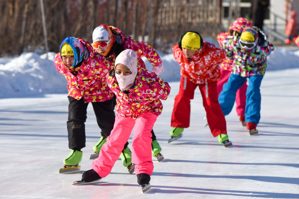 1月13日,在吉林省四平市六馬路小學,學生們在冰場上滑行。新華社記者 張楠 攝