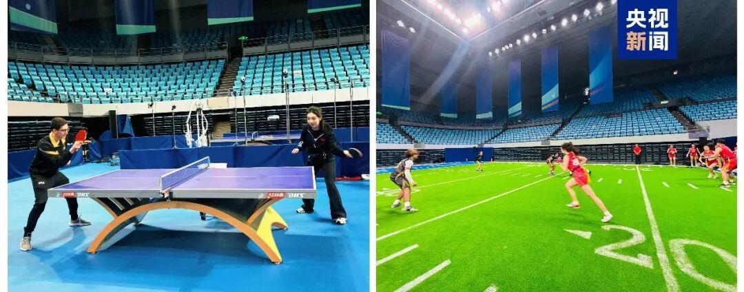 △中美“乒乓外交”55周年紀(jì)念大會現(xiàn)場,中美乒乓球與橄欖球跨項(xiàng)目互動體驗(yàn)。
