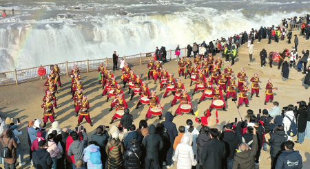 ①1月30日,吉縣壺口瀑布景區(qū)邀請鼓樂隊,為游客呈現了一場特色鮮明、氣勢恢宏的視覺盛宴。