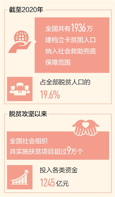 民政部門引導社會組織、慈善力量、專業(yè)社工、志愿者參與脫貧攻堅,使兜底保障既有力度,更有溫度。脫貧攻堅以來,全國社會組織共實施扶貧項目超過9萬個,投入各類資金1245億元,為決戰(zhàn)決勝脫貧攻堅作出了重要貢獻。