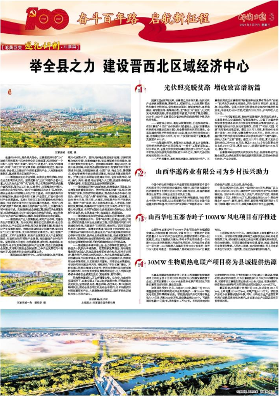——經(jīng)濟(jì)綜合實(shí)力顯著增強(qiáng)。昔日的五寨是一個(gè)老山區(qū)、窮地方。通過100年的努力,五寨經(jīng)濟(jì)總量快速增長,綜合實(shí)力大幅提升。特別是黨的十八大以來,五寨縣立足風(fēng)、光、農(nóng)業(yè)等優(yōu)勢,壯大核心企業(yè),延長產(chǎn)業(yè)鏈條,推動(dòng)經(jīng)濟(jì)綜合實(shí)力顯著提升??傃b機(jī)容量78.6兆瓦的光伏電站、1×30兆瓦生物質(zhì)熱電聯(lián)產(chǎn)、總規(guī)模400兆瓦的風(fēng)力發(fā)電、晉西北天然氣、昌茂石油、金航運(yùn)輸?shù)纫慌卮螽a(chǎn)業(yè)項(xiàng)目建成投產(chǎn);五寨現(xiàn)代農(nóng)業(yè)產(chǎn)業(yè)園區(qū)成功入選國家首批農(nóng)村產(chǎn)業(yè)融合發(fā)展示范園,示范帶動(dòng)效應(yīng)日益顯現(xiàn);建成9座大型煤炭集運(yùn)站,帶動(dòng)發(fā)煤企業(yè)達(dá)90余戶,形成了具有地域特點(diǎn)的煤炭發(fā)運(yùn)基地,既實(shí)現(xiàn)了煤炭產(chǎn)業(yè)“無中生有”,又有效帶動(dòng)餐飲、住宿、汽修汽配、成品油經(jīng)營、餐飲服務(wù)等相關(guān)產(chǎn)業(yè)快速發(fā)展,使第三產(chǎn)業(yè)成為全縣經(jīng)濟(jì)的支柱產(chǎn)業(yè),推動(dòng)縣域高質(zhì)量轉(zhuǎn)型發(fā)展邁出新步伐。2020年,全縣地區(qū)生產(chǎn)總值完成31.4億元,是1949年的786倍。