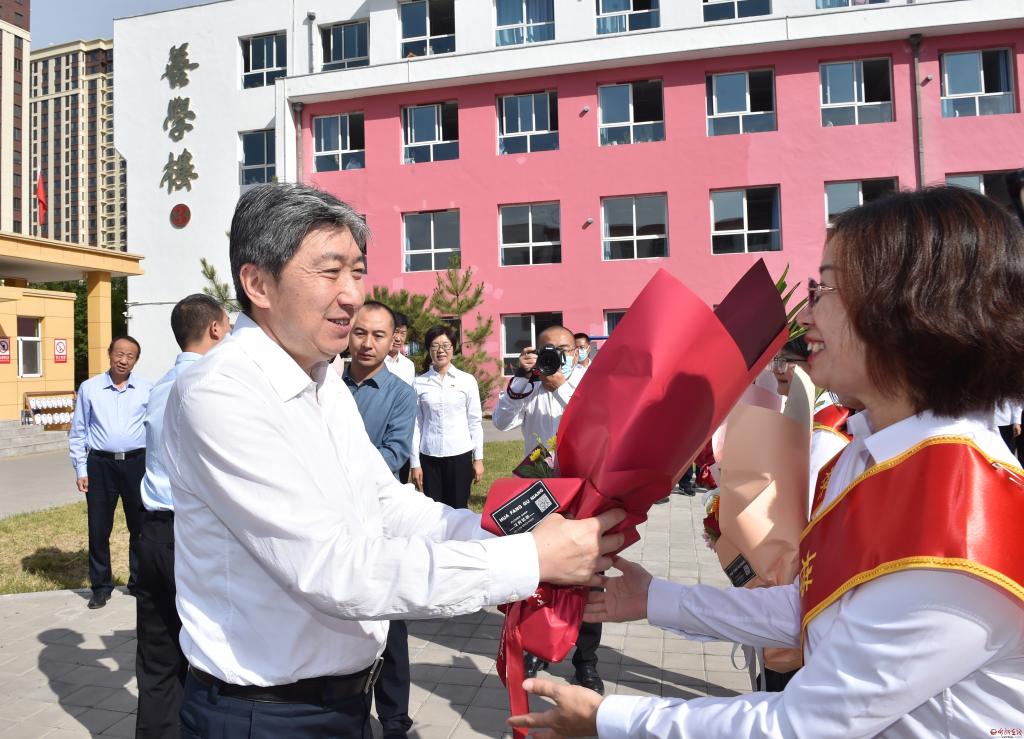 每到一處,朱曉東都與教師們深入交流,了解學校建設(shè)發(fā)展情況,關(guān)切詢問他們的工作生活情況,感謝他們?yōu)槲沂薪逃聵I(yè)發(fā)展作出的貢獻,并為優(yōu)秀教師代表送上了鮮花,祝他們節(jié)日快樂。朱曉東指出,新一屆省委、省政府作出構(gòu)建“一群兩區(qū)三圈”城鄉(xiāng)區(qū)域發(fā)展新格局的重大戰(zhàn)略部署,明確提出“強勢打造太忻一體化經(jīng)濟區(qū)北引擎,引領(lǐng)帶動忻州與太原、雄安新區(qū)相向發(fā)展,打造我省融入京津冀和服務(wù)雄安新區(qū)的重要走廊”,賦予忻州“建設(shè)開放發(fā)展前沿城市”的戰(zhàn)略定位,忻州發(fā)展迎來了前所未有、千載難逢的重大機遇。不論是太忻一體化經(jīng)濟區(qū)建設(shè),還是建設(shè)開放發(fā)展前沿城市,都離不開人才的支撐。希望廣大教育工作者身在學校、心系全局,秉持“負責任、動腦筋、講良心”的工作要求,潛心教學鉆研、立德樹人,以更加飽滿的熱情投身教育事業(yè),為忻州經(jīng)濟社會發(fā)展培養(yǎng)更多的優(yōu)秀人才。