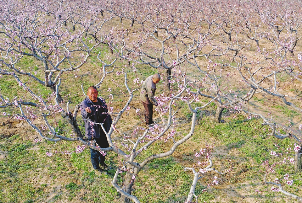 3月30日,在臨汾市襄汾縣大鄧鄉(xiāng)上西梁村,果農(nóng)在桃園開展春管作業(yè)。日前,上西梁村上百畝桃樹進入盛花期,當?shù)剞r(nóng)民搶抓農(nóng)時對桃園開展追肥、灌溉、疏花等系列農(nóng)事活動,確保果樹正常生長、果實優(yōu)質(zhì)高產(chǎn)。李現(xiàn)俊攝
