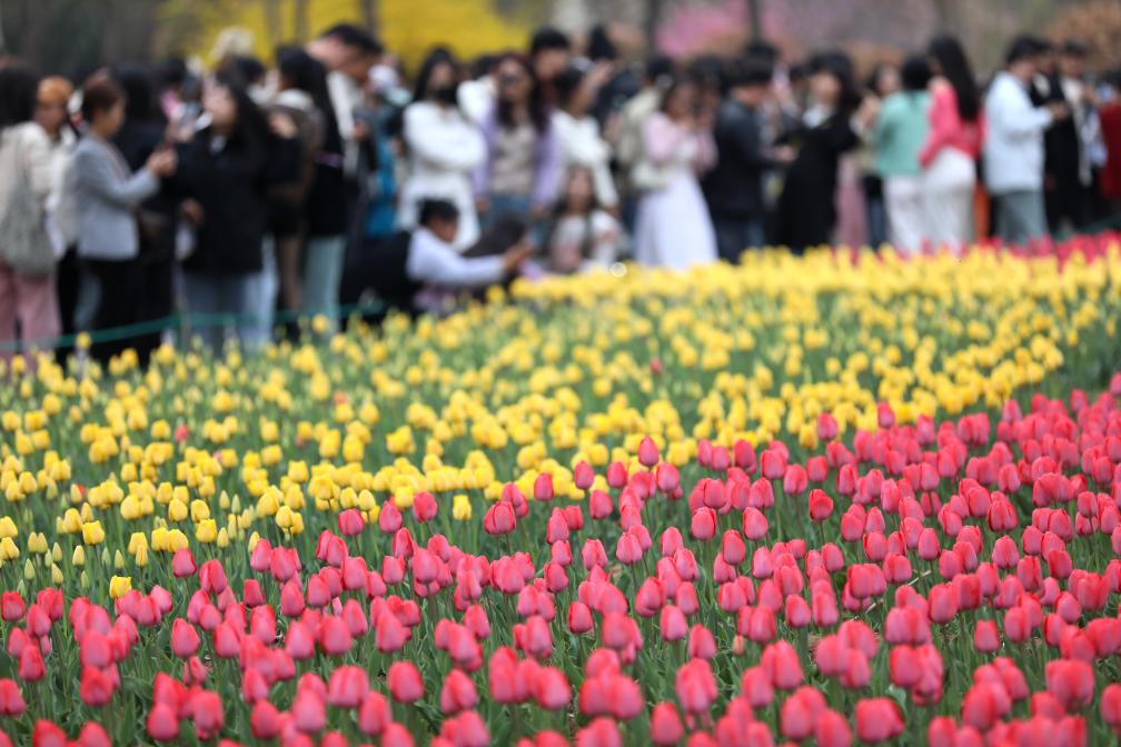 2024年4月5日,游客在河北滄州名人植物園內(nèi)賞花游玩。新華社發(fā)(周洋攝)