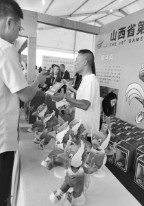 開幕式前,提前一兩個小時安檢入場的觀眾,遠(yuǎn)遠(yuǎn)就看到“翔翔”的召喚,紛紛在吉祥物專營區(qū)扎堆?!?8元一個,就剩30個了。”專營區(qū)的售賣者告訴山西晚報記者,他們也沒想到這只褐馬雞如此受歡迎,很快就要被搶沒了。大同的趙女士搶到一個,她說朋友從外地剛回來不方便出門,讓她買一個留作紀(jì)念。