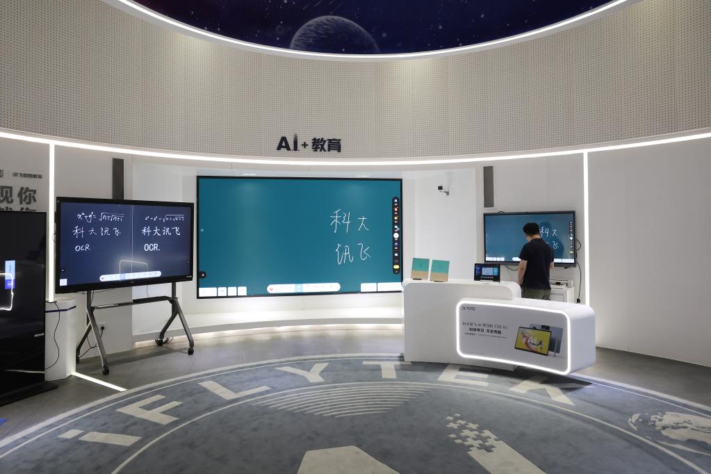 5月30日,在合肥科大訊飛人工智能體驗館,參觀者體驗應(yīng)用于教育行業(yè)的人工智能產(chǎn)品。新華社記者杜瀟逸攝