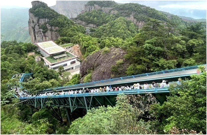 5月27日,在浙江省仙居縣神仙居景區(qū),游客絡(luò)繹不絕,排隊(duì)搭乘纜車和自動扶梯上山觀景。