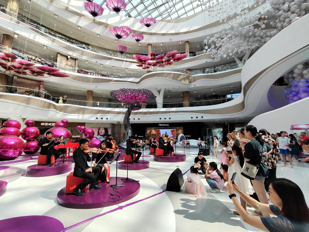 端午假期,海口國際免稅城內(nèi),伴隨著悠揚(yáng)的音樂,陽光傾瀉“天際秘林”夢幻舞臺,正在購物的游客們紛紛駐足欣賞?!耙粓鍪覂?nèi)音樂會,給購物消費(fèi)增添了新意和氛圍感。”海口市民陳蕾沉浸在陽光和音樂中。