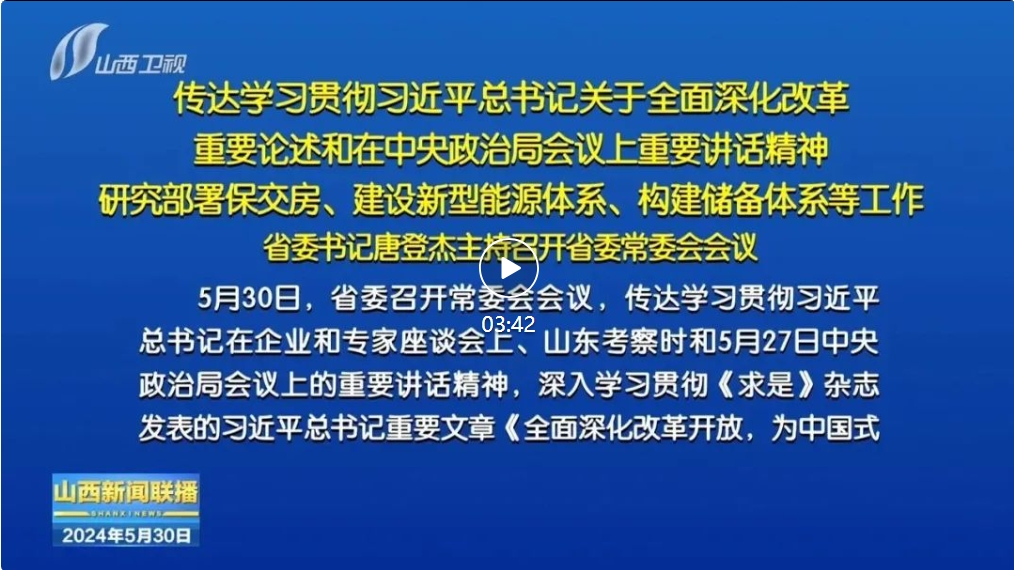山西日報報道 5月30日,省委召開常委會會議,傳達(dá)學(xué)習(xí)貫徹習(xí)近平總書記在企業(yè)和專家座談會上、山東考察時和5月27日中央政治局會議上的重要講話精神,深入學(xué)習(xí)貫徹《求是》雜志發(fā)表的習(xí)近平總書記重要文章《全面深化改革開放,為中國式現(xiàn)代化持續(xù)注入強勁動力》,傳達(dá)貫徹全國切實做好保交房工作視頻會議精神,審議通過《山西省加快規(guī)劃建設(shè)新型能源體系的實施意見》《關(guān)于構(gòu)建山西省儲備體系的行動方案》。省委書記唐登杰主持會議。