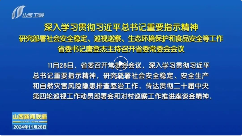 山西日?qǐng)?bào)報(bào)道 11月28日,省委召開(kāi)常委會(huì)會(huì)議,深入學(xué)習(xí)貫徹習(xí)近平總書記重要指示精神,研究部署社會(huì)安全穩(wěn)定、安全生產(chǎn)和自然災(zāi)害風(fēng)險(xiǎn)隱患排查整治工作,傳達(dá)貫徹二十屆中央第四輪巡視工作動(dòng)員部署會(huì)和對(duì)村巡察工作推進(jìn)座談會(huì)精神,聽(tīng)取全省打好污染防治攻堅(jiān)戰(zhàn)和加強(qiáng)食品安全監(jiān)管等情況匯報(bào)。省委書記唐登杰主持會(huì)議。