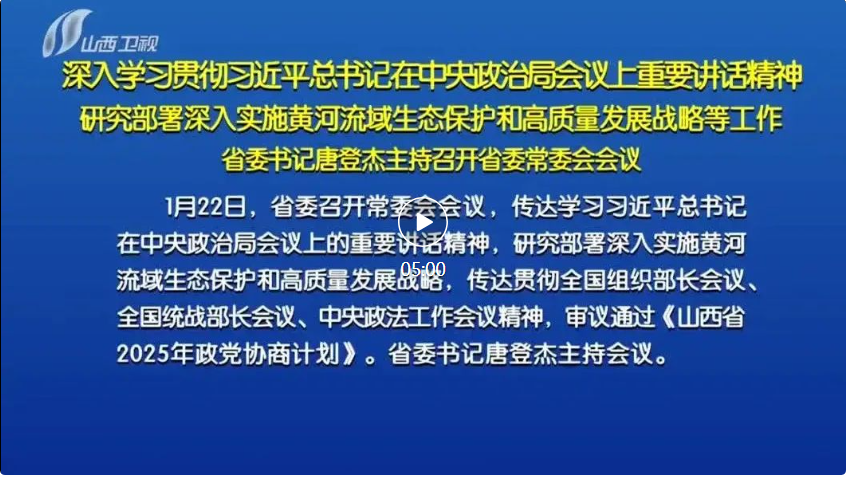 山西日?qǐng)?bào)報(bào)道 1月22日,省委召開常委會(huì)會(huì)議,傳達(dá)學(xué)習(xí)習(xí)近平總書記在中央政治局會(huì)議上的重要講話精神,研究部署深入實(shí)施黃河流域生態(tài)保護(hù)和高質(zhì)量發(fā)展戰(zhàn)略,傳達(dá)貫徹全國組織部長(zhǎng)會(huì)議、全國統(tǒng)戰(zhàn)部長(zhǎng)會(huì)議、中央政法工作會(huì)議精神,審議通過《山西省2025年政黨協(xié)商計(jì)劃》。省委書記唐登杰主持會(huì)議。