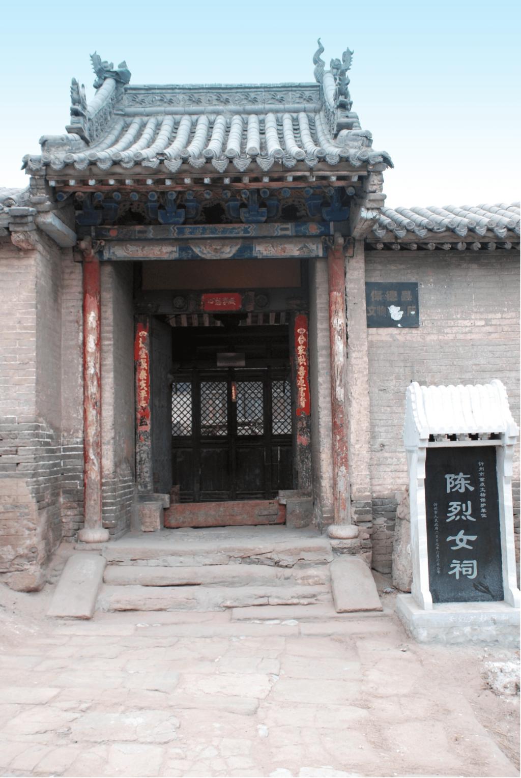陳烈女祠坐西向東,為二進院落布局。占地面積685平方米。大門一座,前院過殿面寬三間,單檐硬山頂;南北配殿各面寬三間,單檐硬山頂。后院正殿面寬三間,單檐硬山頂,前設小抱廈;后院正殿內(nèi)供奉陳烈女塑像。祠內(nèi)存有明崇禎七年(1634)“圣旨(復制品)”一道,新繪壁畫16平方米。2007年6月,陳烈女祠被忻州市人民政府公布為市級文物保護單位。