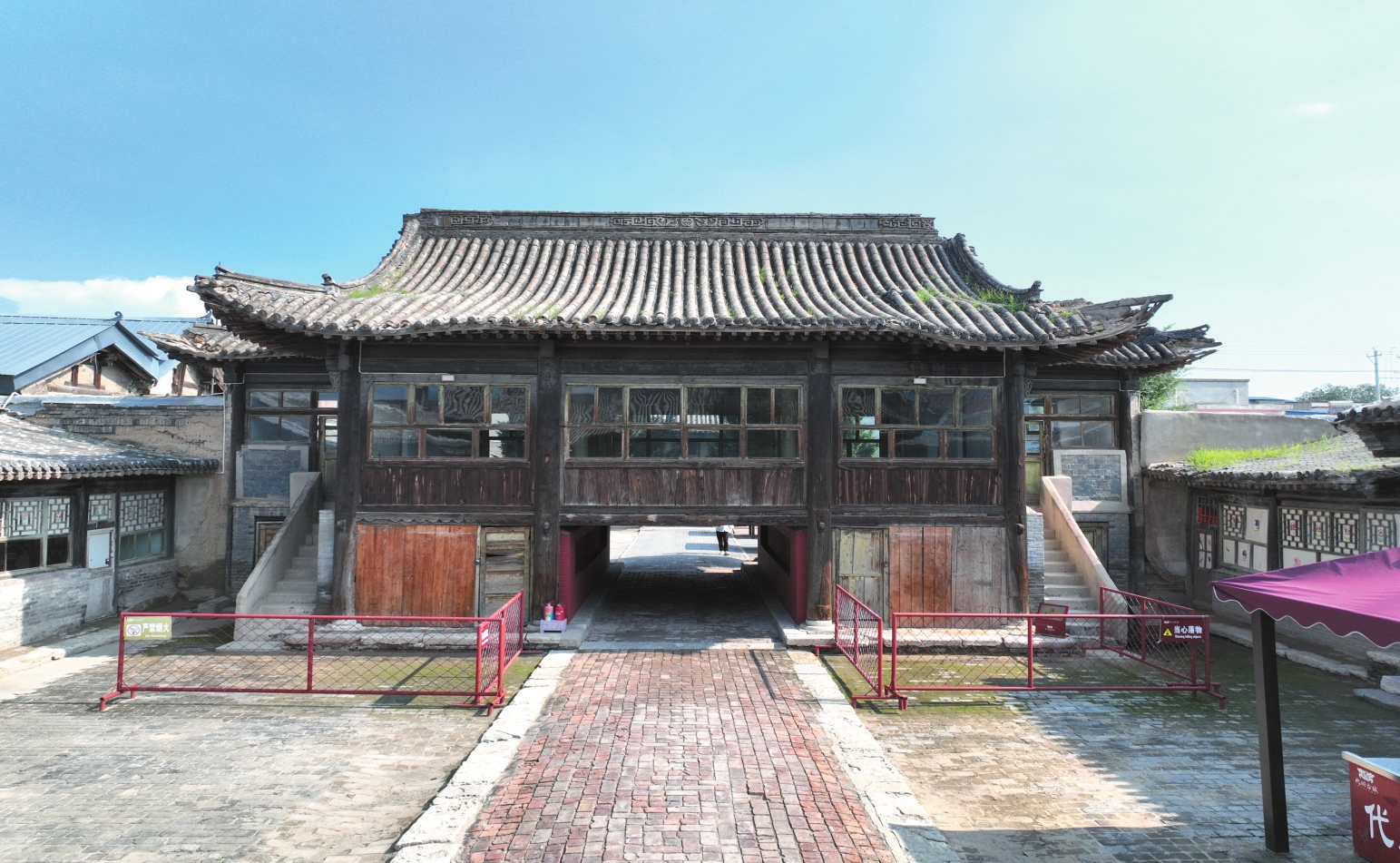 該廟坐北朝南,占地面積2564平方米,三進院落布局。中軸線上依次建有山門、戲臺、獻殿、正殿和后殿。兩側(cè)為東西配殿及耳殿。正殿與獻殿相連,屋頂呈勾連搭式,臺基共用。磚砌臺基,基寬19.4米、深15.4米、高0.7米。面寬五間,進深四椽。正殿單檐懸山頂,五檁無廊式構(gòu)架,獻殿單檐卷棚懸山頂,四檁卷棚式構(gòu)架。戲臺為磚砌臺基,基寬10.8米、深10.4米、高0.5米,為上下兩層磚木結(jié)構(gòu)。下層明間設通道,兩次間設封護墻;上層面寬三間,進深四椽,單檐歇山頂,兩側(cè)附半歇山式耳樓,前檐裝修已改。