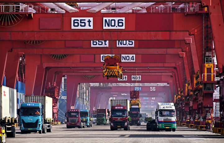 2024年2月11日,卡車在青島港集裝箱碼頭裝運集裝箱。新華社記者 李紫恒 攝