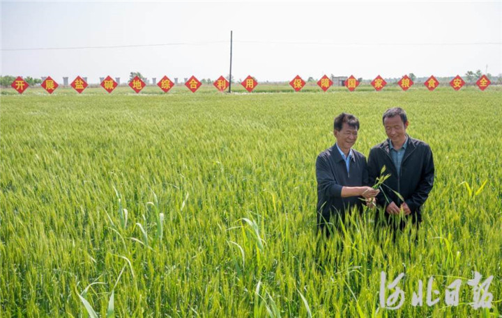 2023年5月,河北省滄州市黃驊市舊城鎮(zhèn)仙莊片區(qū)旱堿地麥田,后仙莊村村民楊東進(右)和后仙莊村黨支部副書記劉玉鎖一起查看旱堿麥生長狀況。 河北日報記者 趙杰 攝
