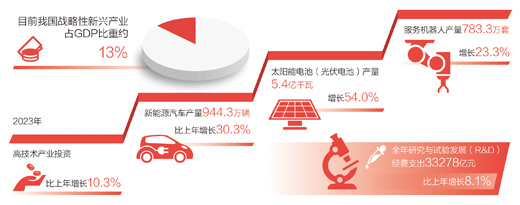 發(fā)展壯大戰(zhàn)略性新興產(chǎn)業(yè)?!皯?zhàn)略性新興產(chǎn)業(yè)具有創(chuàng)新活躍、技術(shù)密集等特點(diǎn),為新質(zhì)生產(chǎn)力發(fā)展壯大提供了巨大空間?!备呶拇碚f,近年來,我國戰(zhàn)略性新興產(chǎn)業(yè)蓬勃發(fā)展,目前戰(zhàn)略性新興產(chǎn)業(yè)占GDP比重約13%。
