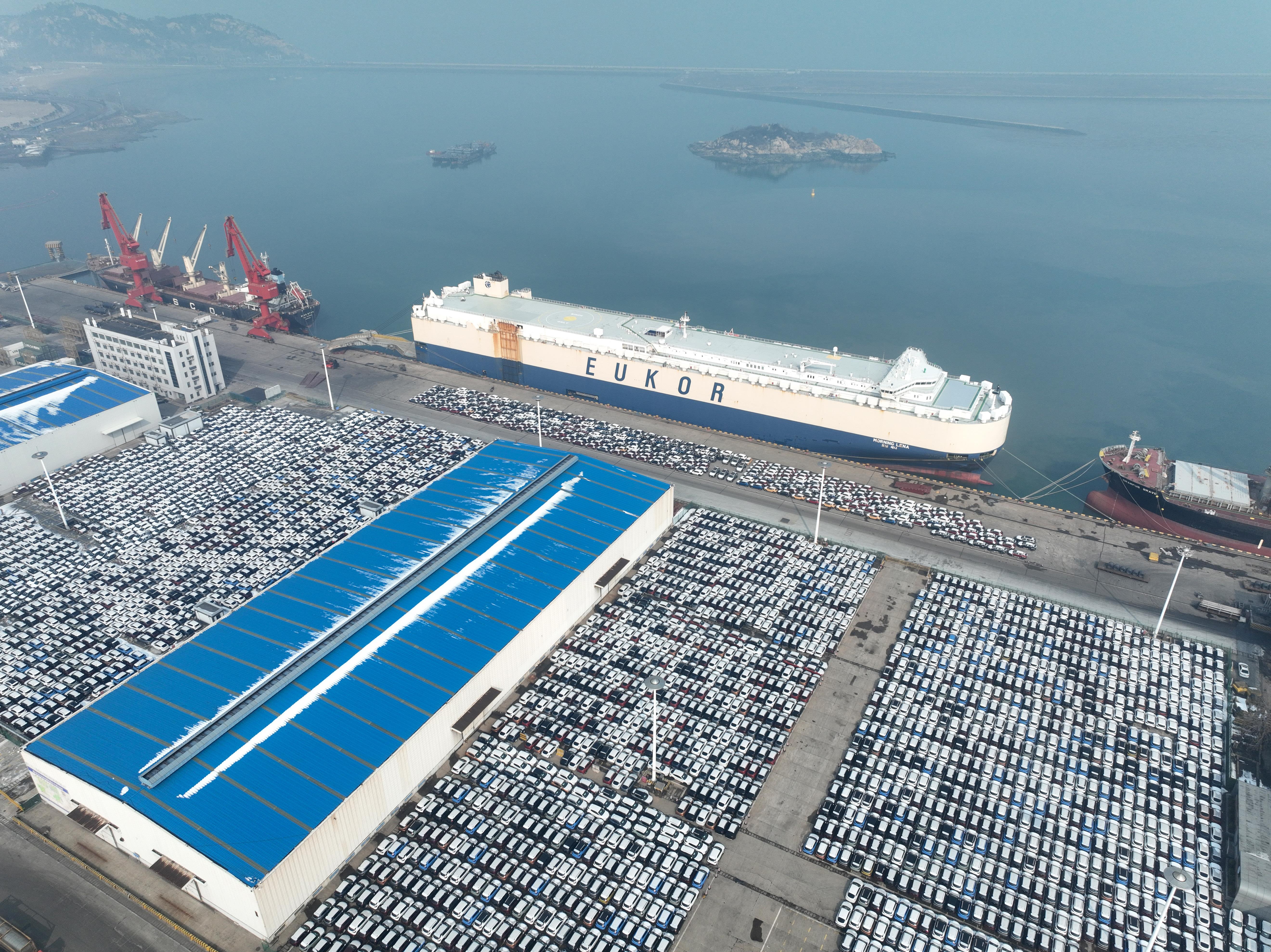 △在江蘇連云港港東方港務分公司碼頭,貨輪靠泊準備裝載汽車出口海外。