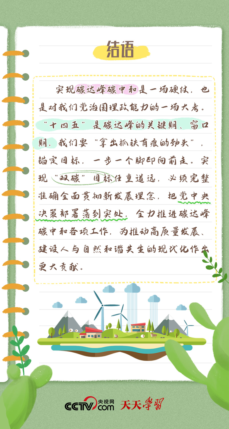 天天學(xué)習(xí)今年全國(guó)兩會(huì),習(xí)近平總書(shū)記在政協(xié)聯(lián)組會(huì)上,對(duì)“雙碳”工作作出最新部署??倳?shū)記強(qiáng)調(diào):“全面準(zhǔn)確落實(shí)精準(zhǔn)治污、科學(xué)治污、依法治污方針,推動(dòng)經(jīng)濟(jì)社會(huì)發(fā)展綠色化、低碳化,加強(qiáng)資源節(jié)約集約循環(huán)利用,拓展生態(tài)產(chǎn)品價(jià)值實(shí)現(xiàn)路徑,積極穩(wěn)妥推進(jìn)碳達(dá)峰碳中和,為高質(zhì)量發(fā)展注入新動(dòng)能、塑造新優(yōu)勢(shì)。”