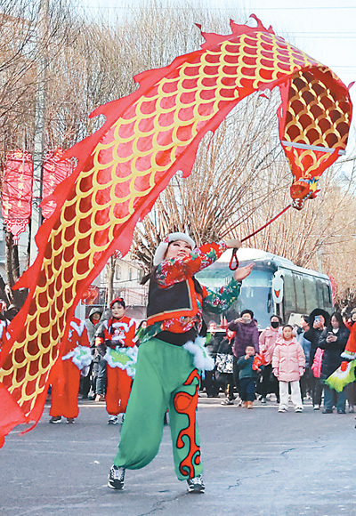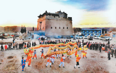 河曲縣古城堡下的雙龍舞展演。張玉明攝