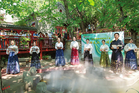 在太山景區(qū)售票廳里,背誦古詩詞免門票的活動吸引了不少18周歲以下的學(xué)生參加,大家通過轉(zhuǎn)盤選定需要背誦的古詩詞,完成背誦即可獲得門票一張?!昂屯瑢W(xué)們正好一塊兒來了,通過參加這個活動,弘揚我們的傳統(tǒng)文化,是非常有意義的?!苯衲晔钇冢骄皡^(qū)面向廣大學(xué)生推出皮影戲、手工DIY印章、拓印等非遺體驗活動。同時,景區(qū)還準(zhǔn)備了2000多套漢服,免費為游客提供。