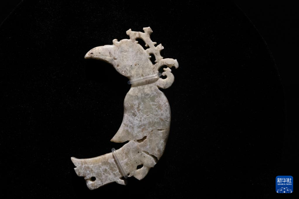 這是7月28日在重慶中國三峽博物館舉行的“玉出大江——長(zhǎng)江流域史前玉器特展”上拍攝的肖家屋脊文化玉鳳。(新華社記者 黃偉 攝)