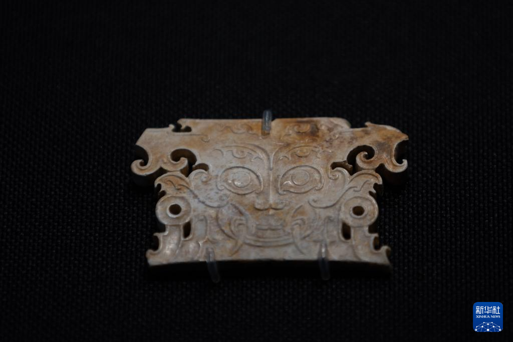 這是7月28日在重慶中國三峽博物館舉行的“玉出大江——長(zhǎng)江流域史前玉器特展”上拍攝的肖家屋脊文化獠牙神面玉牌飾。(新華社記者 黃偉 攝)