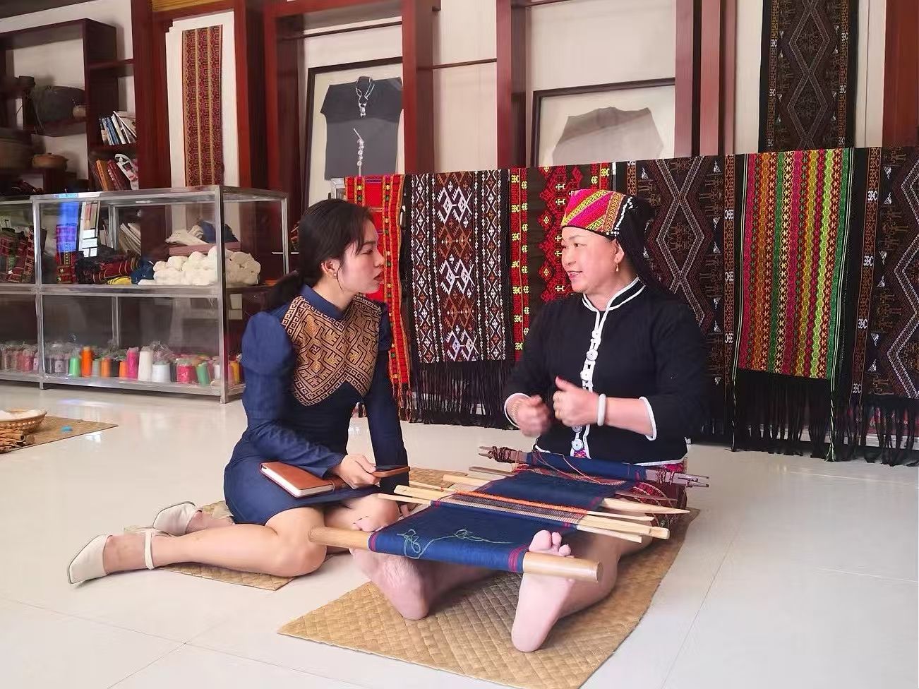 黎族傳統(tǒng)紡染織繡技藝國家級傳承人劉香蘭(右)正在和陳孟麗(左)交流。 受訪者供圖