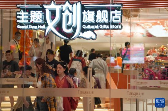游客在西安大唐不夜城一家文創(chuàng)店內(nèi)購(gòu)物游覽(5月20日攝)。