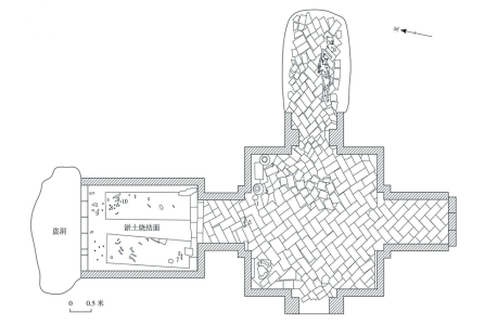 而M27獨(dú)居?xùn)|區(qū),間距達(dá)100余米,與前兩墓形成鮮明反差,墓磚無任何涂紅,隨葬品僅見素面灰陶罐、陶碗,東漢常見釉陶禮器(耳杯、案、盤等)完全消失,墓道呈“口小底大”特殊結(jié)構(gòu),墓室西北角設(shè)灶,突破同期墓葬的空間布局傳統(tǒng)。