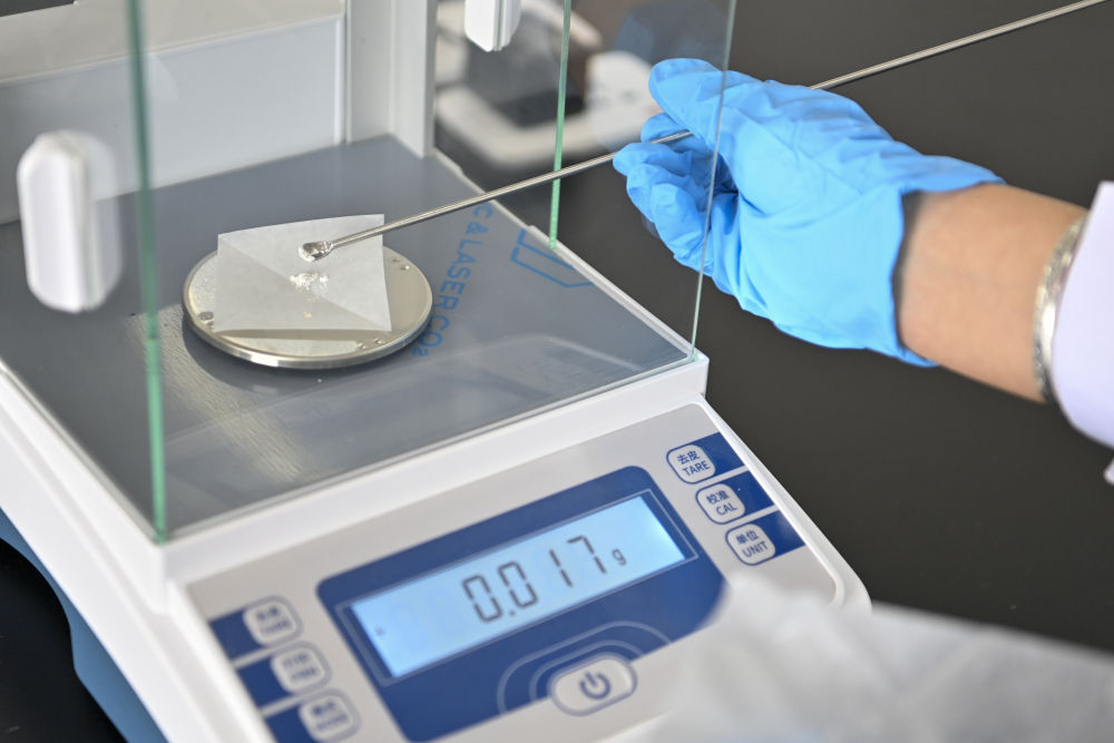 4月16日,在云岡研究院石質(zhì)文物保護研究室,工作人員張帆為石窟壁面樣本稱重。云岡石窟現(xiàn)存主要洞窟45個
