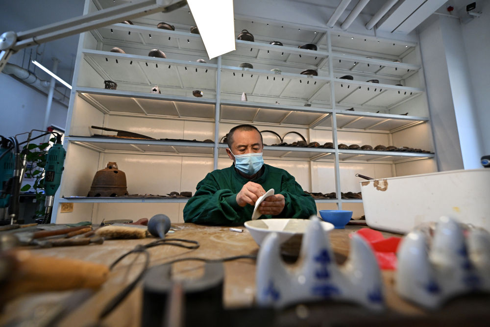 4月15日,在云岡研究院可移動文物修復(fù)室,工作人員劉銓義在進行瓷器修復(fù)。