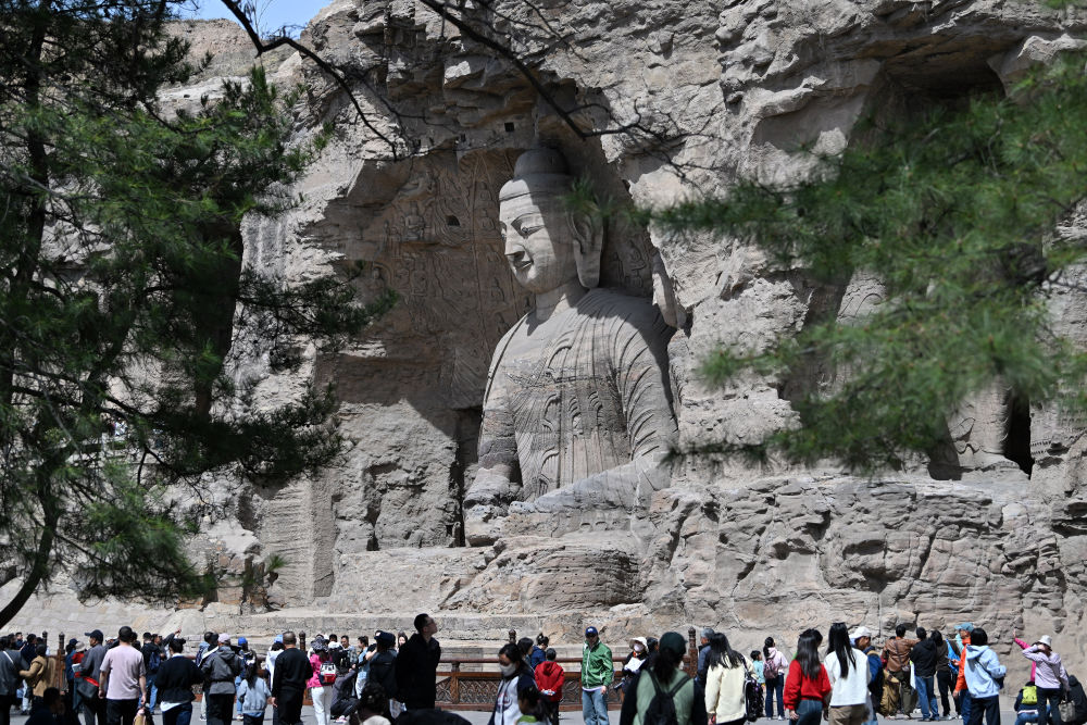 4月16日,在云岡石窟,游客擺出和大佛隔空“擊掌”的姿勢留影。