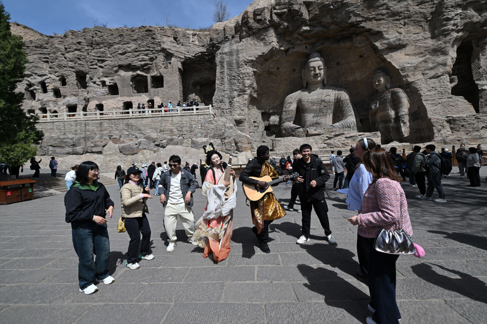 4月15日,在云岡石窟,身著傳統(tǒng)服裝的演員和游客互動。