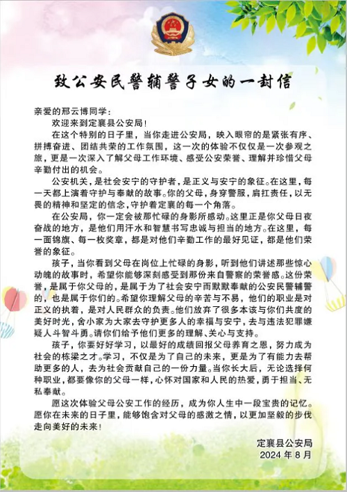 為進(jìn)一步增強(qiáng)中小學(xué)生反詐、禁毒、交通安全意識(shí),通過(guò)小手拉大手等形式,大力學(xué)習(xí)、宣傳、弘揚(yáng)武霖同志英勇無(wú)畏、忠誠(chéng)為民的高尚品質(zhì)。8月20日上午,定襄縣公安局精心策劃,組織開(kāi)展了“警娃探警營(yíng)”主題警營(yíng)體驗(yàn)日活動(dòng),50余名民輔警子女和警爸警媽共同走進(jìn)警營(yíng),體驗(yàn)警察生活、感受警營(yíng)文化。