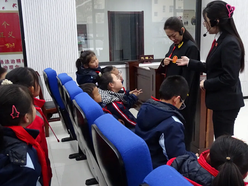 在審判法庭,法院干警深入淺出地向?qū)W生們介紹了法庭的分設(shè)區(qū)域、庭審流程、訴訟參與人、法槌起源和具體的使用方法。通過互換角色的“沉浸式”體驗,法律不僅僅是教科書中枯燥無味的文字,法庭的莊重與法律的嚴(yán)謹(jǐn)已化作一幅幅生動的畫面,深深烙印在他們的記憶中。